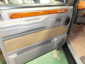 上の写真は ドアーの上部に付いている ウッドパネルです、ウッドパネルの下の部分の 横長の部分は 生地を張り替えました。
