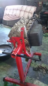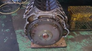 エンジンを下しました 写真はエンジンを横向きにした状態です。