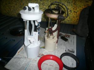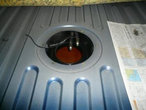 この写真は、トランクルームのフロアーマットを剥がして、ポンプを取り外した所です、丸い部分の下に黒い部分に