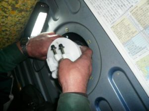 この様に、取り外しや 取り付けを行います。交換する時には 手前の丸いパーツの、パッキンも交換を進めます。