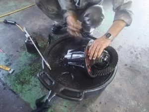 外したデフの歯車などを 石油で洗浄しています、最後は取り付ける前には デフケースをペイントします。