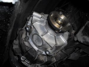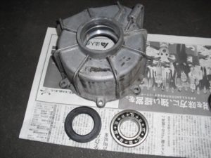 上の写真は、トランスファーを分解してから ベアリングをケースにプレス機を使って、打ち込んでいる様子です。 トランスファーを後ろから見た所です、4つのボルトにシャフトが取り付けられます。トランスファーを分解した写真です。