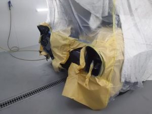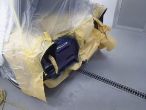 また この際ですから、一緒にラジエターグリルの両サイドの部分が 石跳ねで傷が有りましたので ペイントし直しましたフロントバンパーを外し、配線をカバーしてからの丁寧な 作業をします。