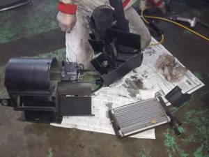 右下の四角の箱はヒーターコアーです、これも時々クーラント漏れでの交換作業で修理入庫して来ます。