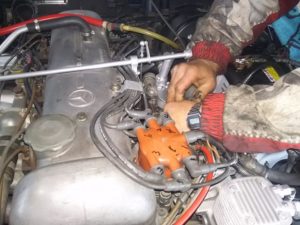 ただ 私のベンツは コールドスタートのパーツも不良なので 冬季の冷間時にはどうしてもエンジン不調な成りますので、今回ここを修理したいと思いますが、このパーツは製造されていなくて ドイツにもアメリカにも無く、いま探している最中なのです。右に有る赤い筒状工具は タイミングライトと言い、タイミングを調べるのに必要な工具の一つです。