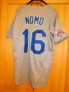 この ユニホームは ドジャースに在籍中に 野茂 ノモ 投手が 1995年7月11日に開催された MLB オールスター戦に出た時の ユニホームです 日本人初の オールスター出場です 右袖には オールスターのワッペンが 縫い付けられています。
